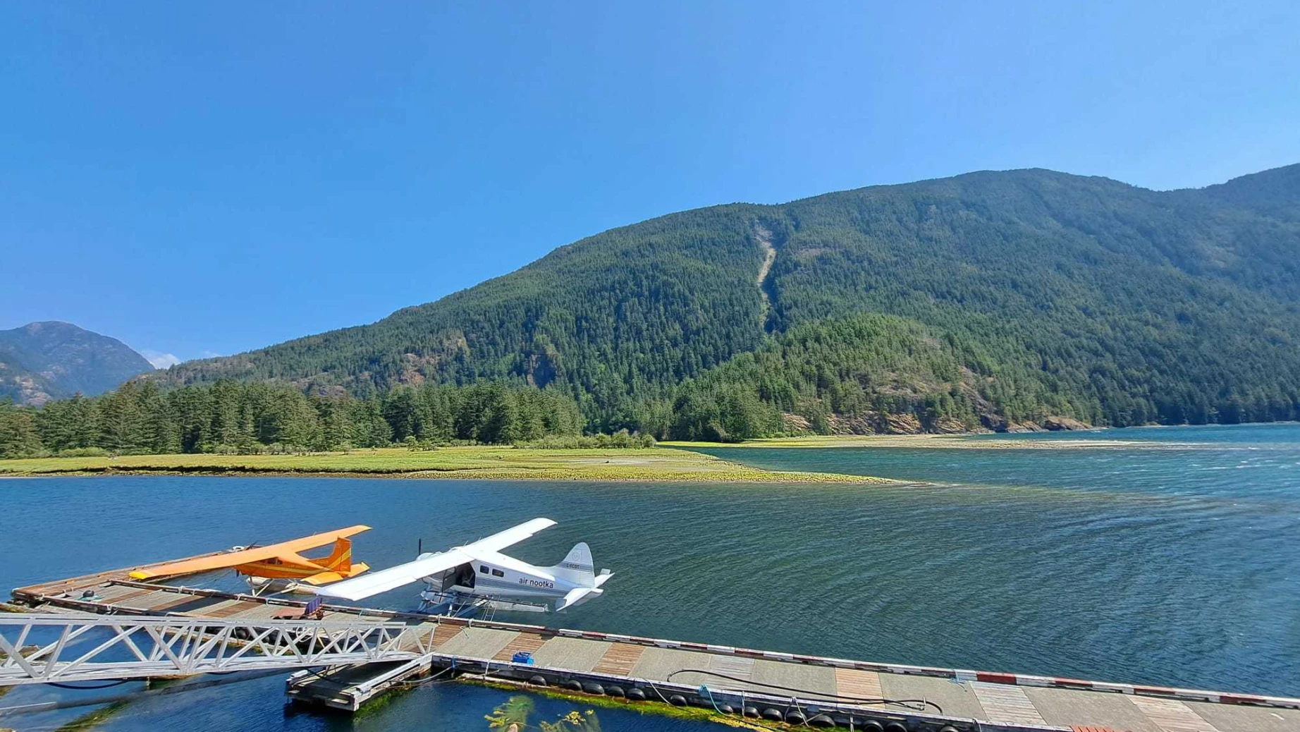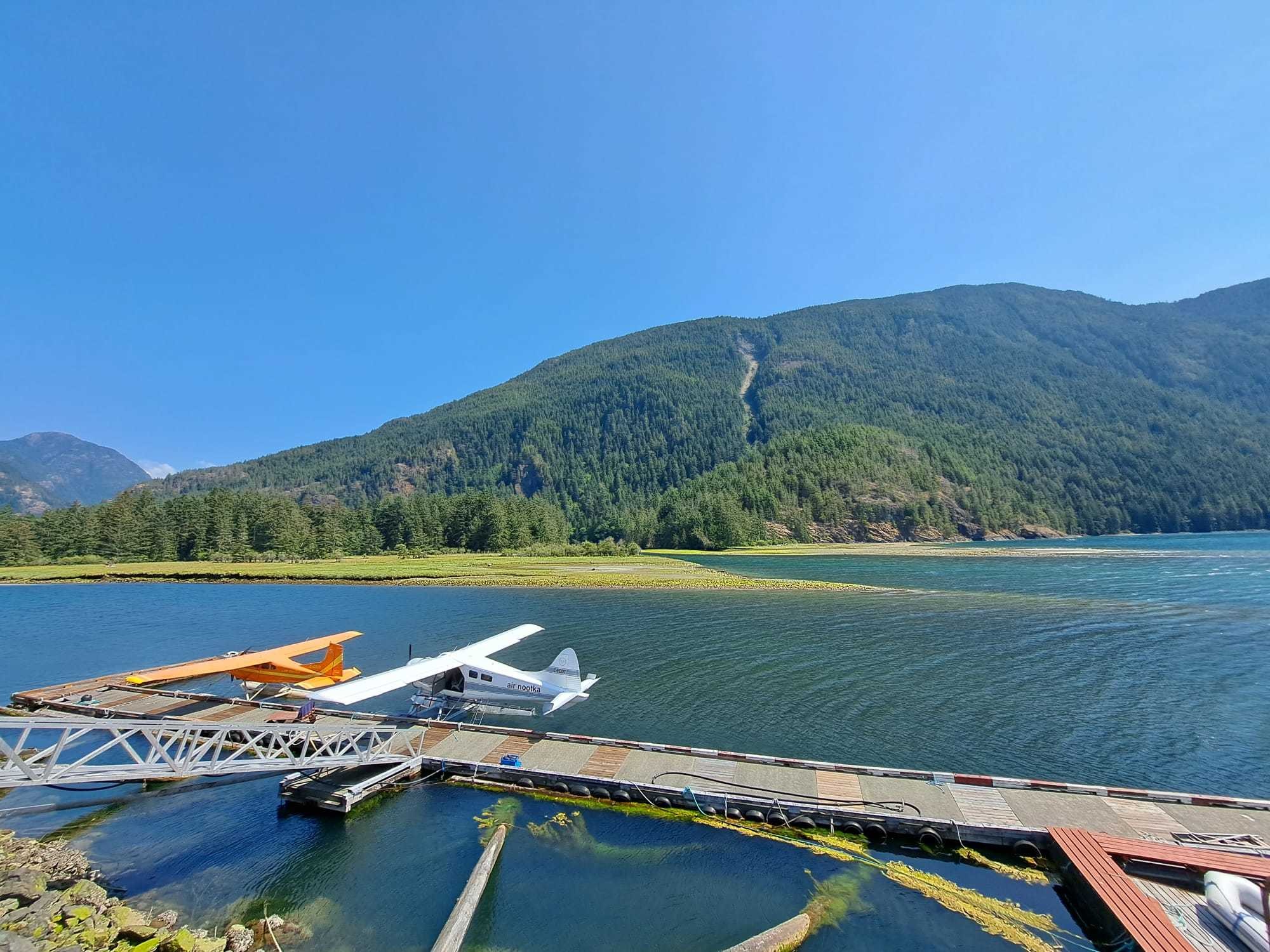 Opstap stijger voor de vlucht met het watervliegtuigje in Gold River